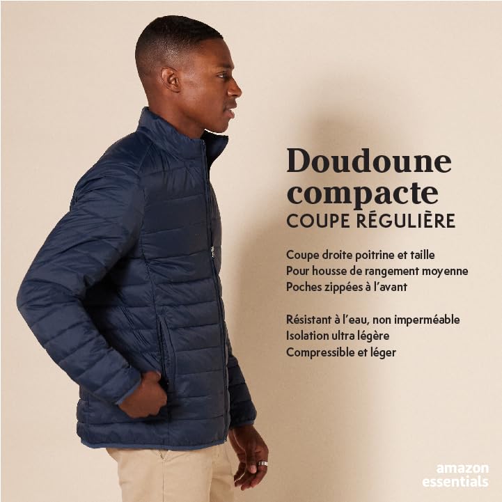 Une marque Amazon – Veste matelassée polyvalente imperméable et légère, idéale par temps froid, dotée d'une fermeture éclair sur le devant et d'un col montant.