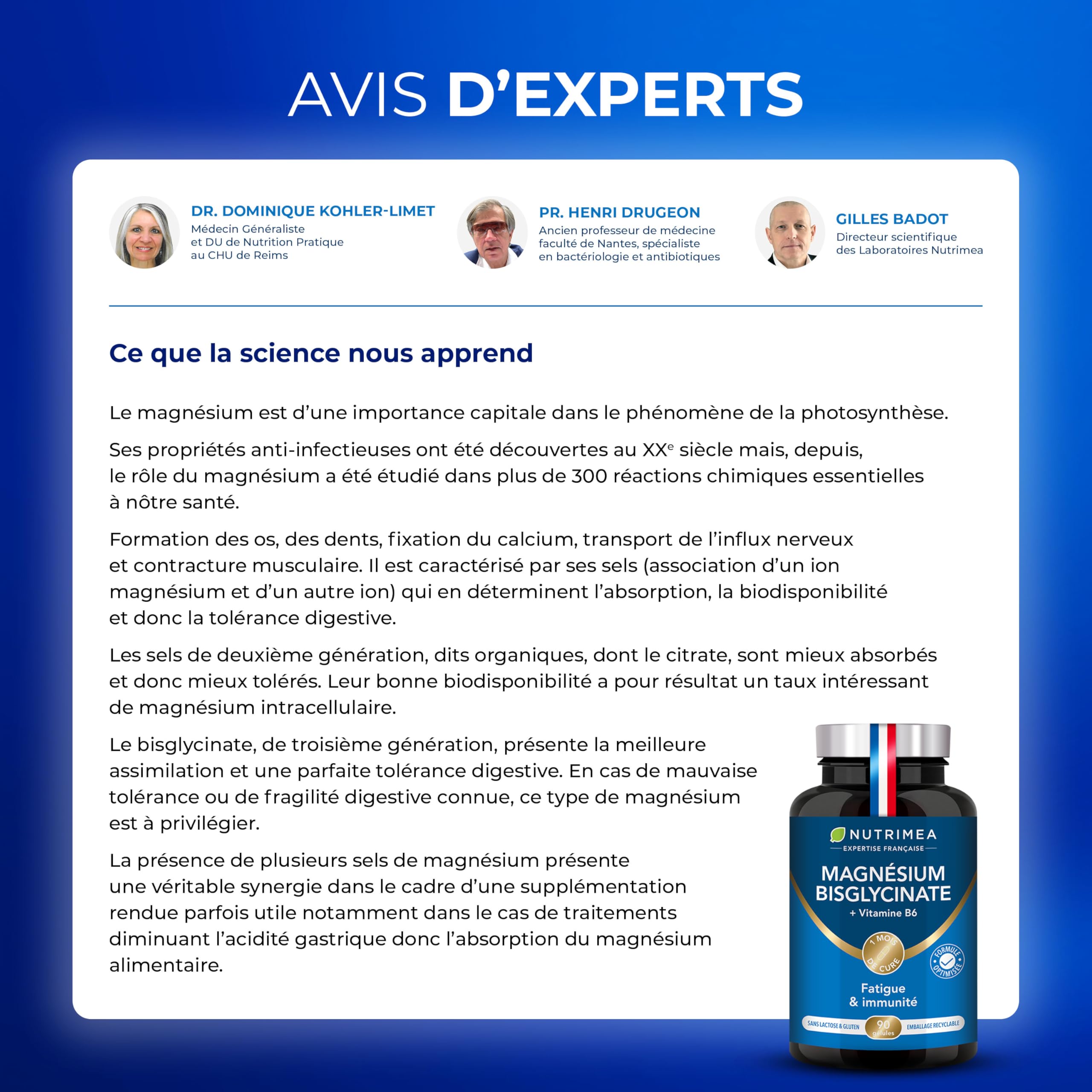 • ●● UNE ASSIMILATION OPTIMISÉE ●● Grâce aux bienfaits du bisglycinate de magnésium, les laboratoires Nutrimea ont mis au point une formule unique alliant excellente tolérance intestinale et absorption optimale. Notre magnésium est ainsi jusquà 8 fois mieux absorbé que d'autres magnésium classiques et diminue drastiquement les effets laxatifs.
