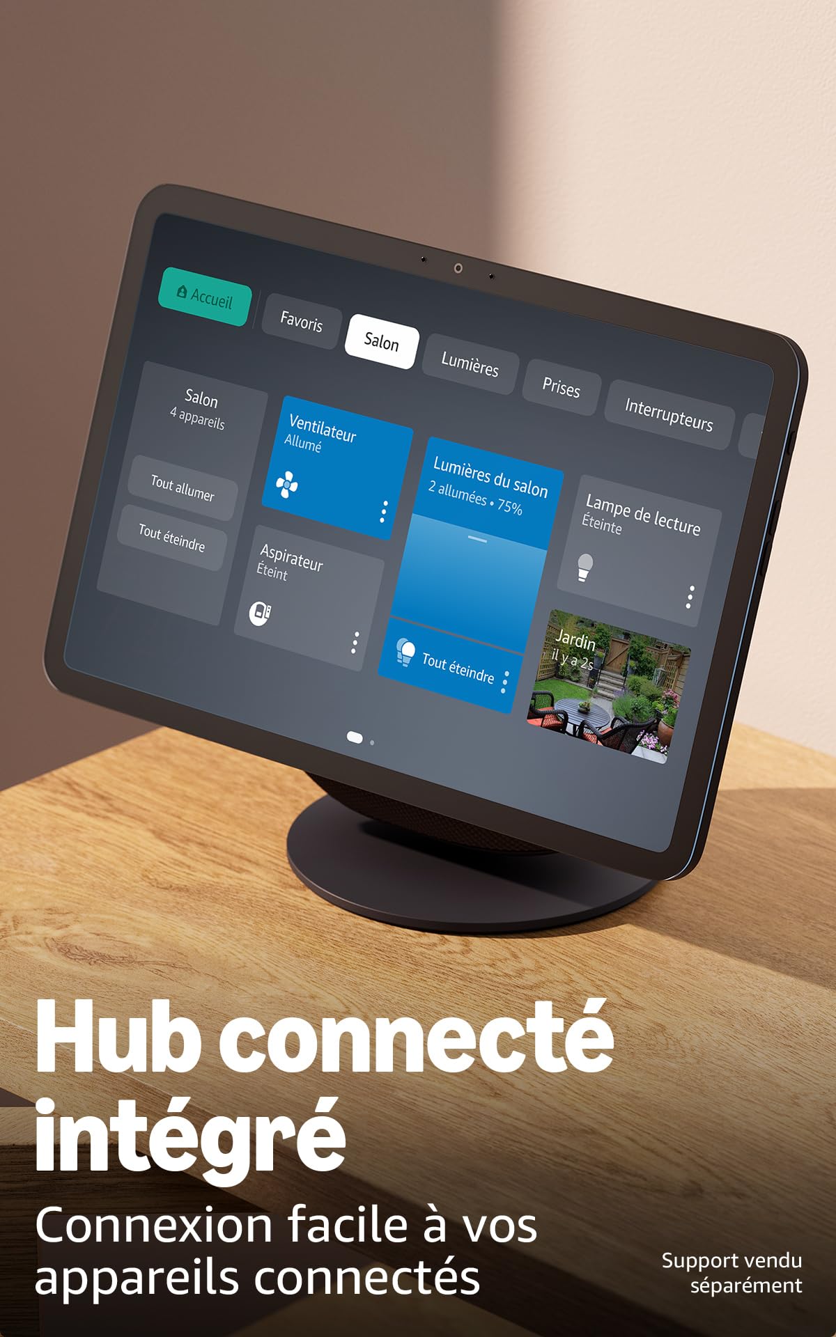 • Contrôlez votre maison connectée en toute simplicité : jumelez et contrôlez des milliers d'appareils fonctionnant avec Alexa, sans avoir recours à un hub connecté séparé. Consultez la vidéo de vos caméras en toute facilité. Gérez vos lumières, thermostats et autres appareils à l'aide de l'écran ou de commandes vocales, ou activez des routines avec la détection de mouvements.