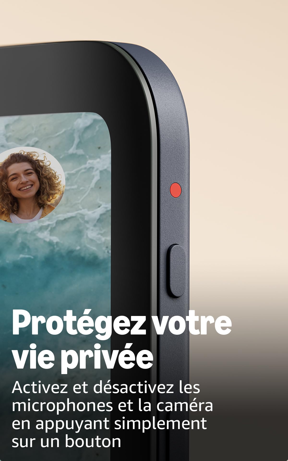 • Conçu pour protéger votre vie privée : Amazon n'a pas pour vocation de vendre vos informations personnelles à des tiers. Cet appareil est conçu avec de multiples éléments de contrôle de vos informations personnelles, dont un bouton intégré permettant d'activer et de désactiver les microphones et la caméra, ainsi que des commandes caméra dédiées (à la fois sur l'appareil et dans l'application).