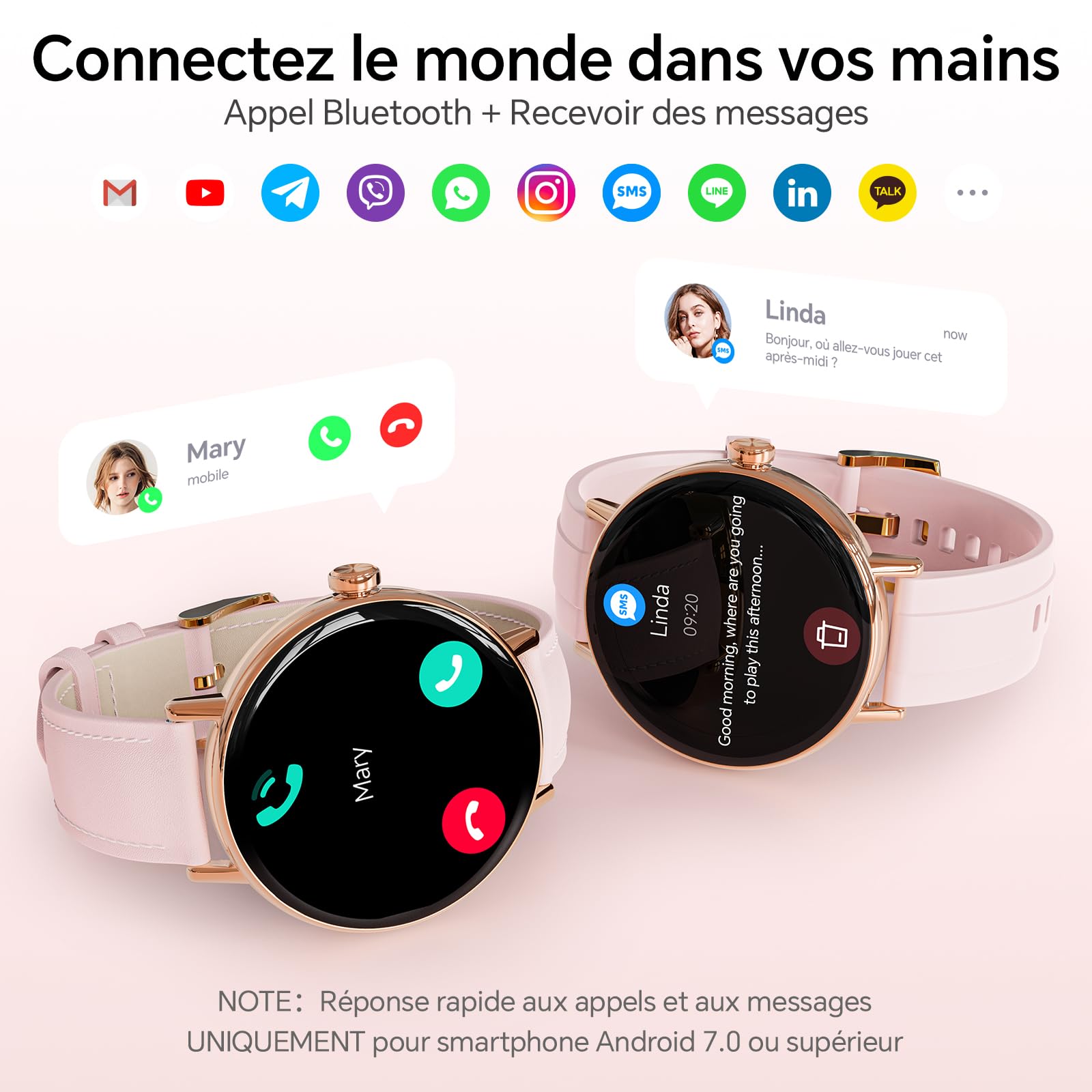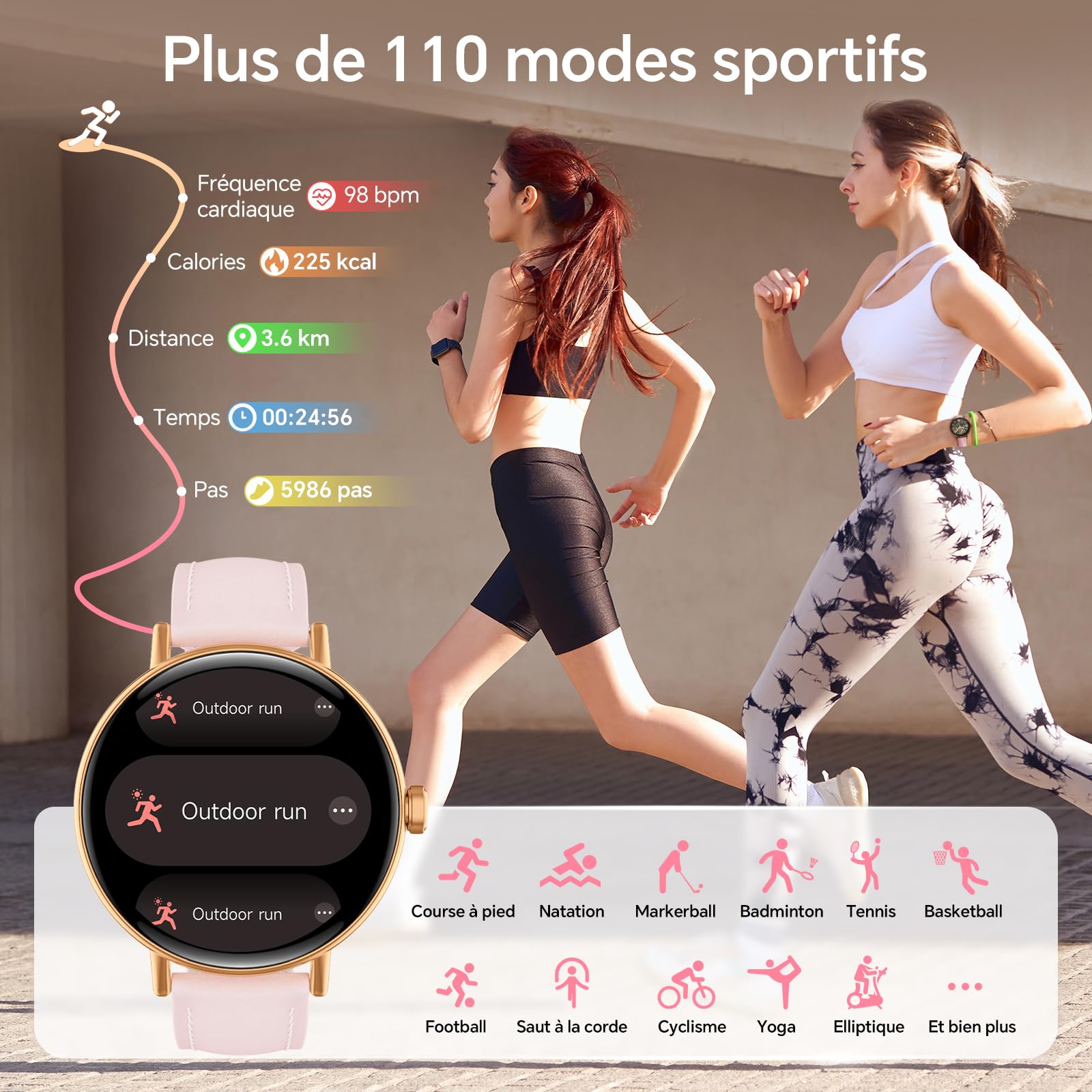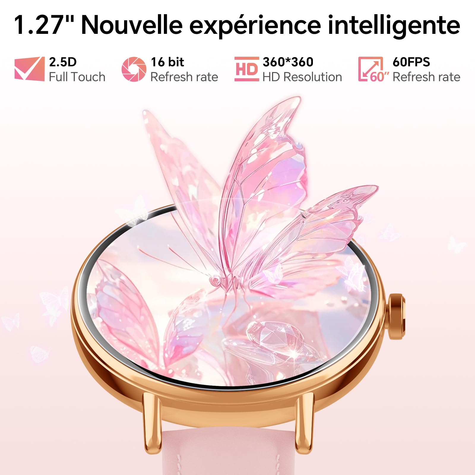 - 【1,27" Écran HD Dynamique 60 FPS】La montre connectée pour femme en cuir élégant offre une fluidité exceptionnelle grâce à son écran HD 1,27"et son taux de rafraîchissement de 60 FPS. Inclut deux bracelets interchangeables (cuir élégant et silicone sportif) et une étanchéité IP68 - parfaite pour le bureau, le sport ou les sorties.