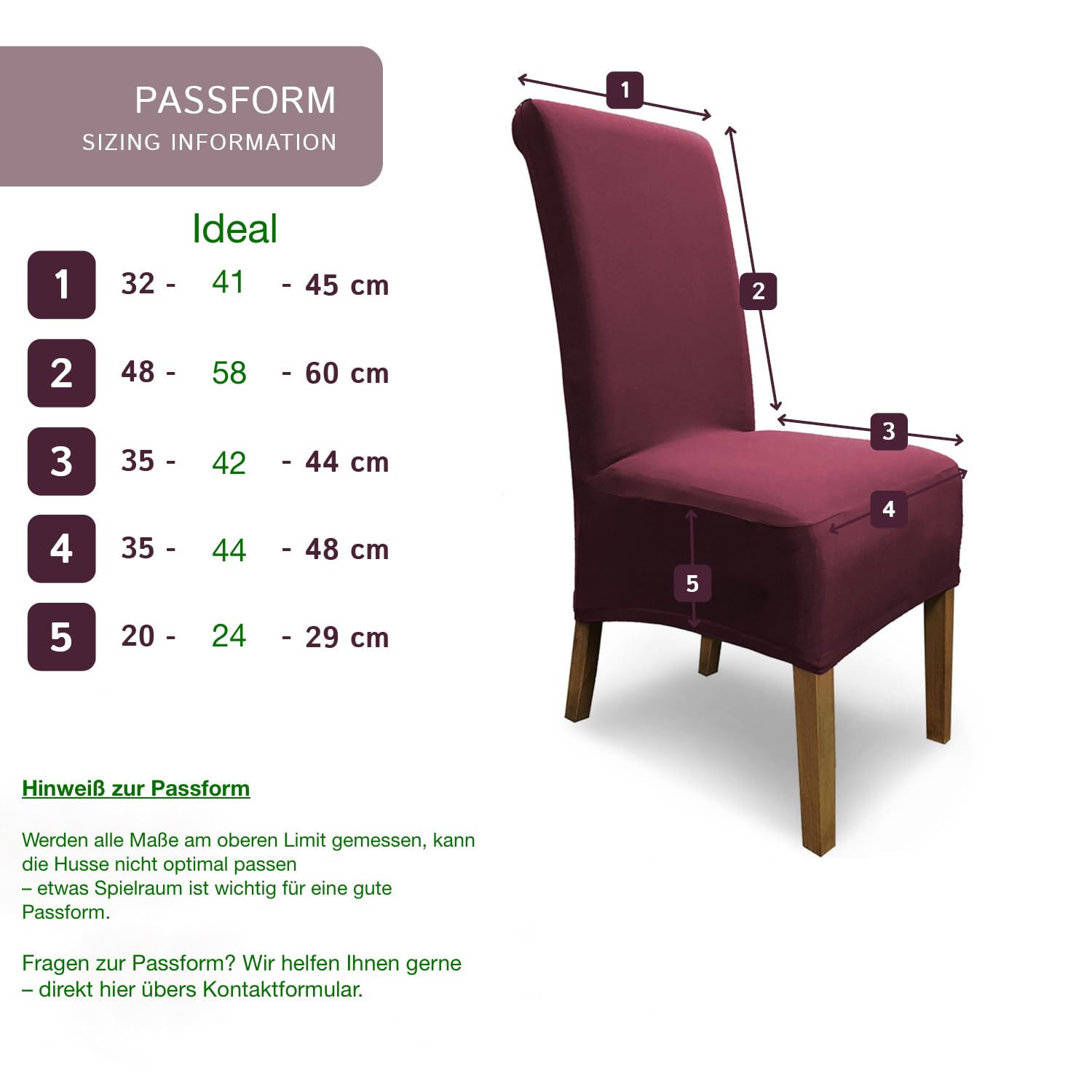• Les housses de chaise sont composées à 96% de coton et 4% de élasthanne. Elles sont très faciles d'entretien et se lavable jusqu'à 40 °. Oeko-Tex Standard 100 testé et certifié qualité